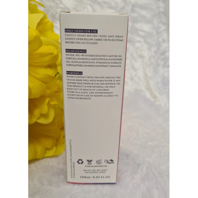 This soothing fragrance spray contains Chamomile Oil which is believed to relieve anxiety, improve sleep, and promote feelings of calm